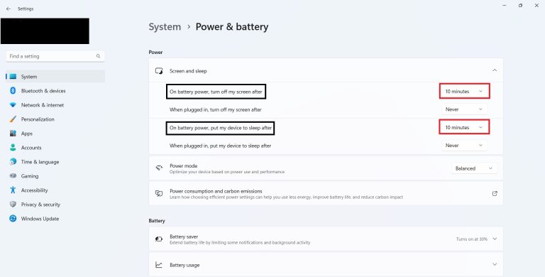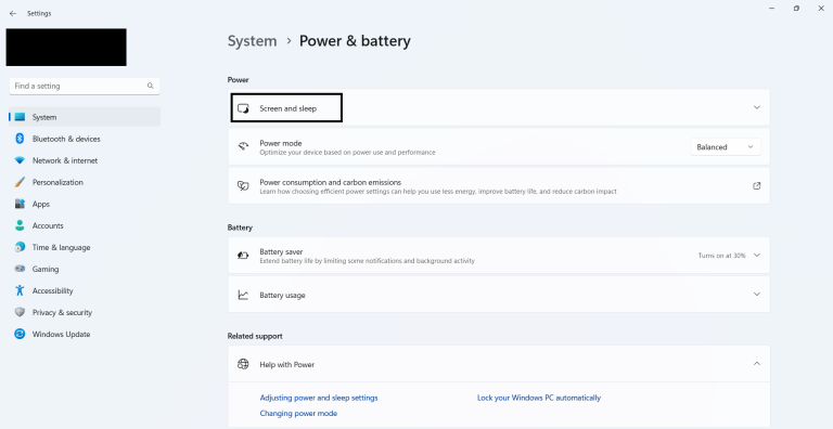 The method is pretty straightforward. You go to the settings via the Start and choose, “Power and battery” in the system tab. Then you may scroll the screen to find the “Screen and sleep” option beneath the “Power” heading. Once you click on it, the four options will open up.